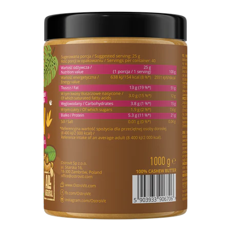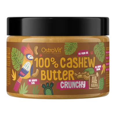 Le Beurre de Noix de Cajou 100% d’OStrovit est un beurre naturel, fabriqué uniquement à partir de noix de cajou de haute qualité, sans ajout de sucre, de sel ou d’huile de palme.