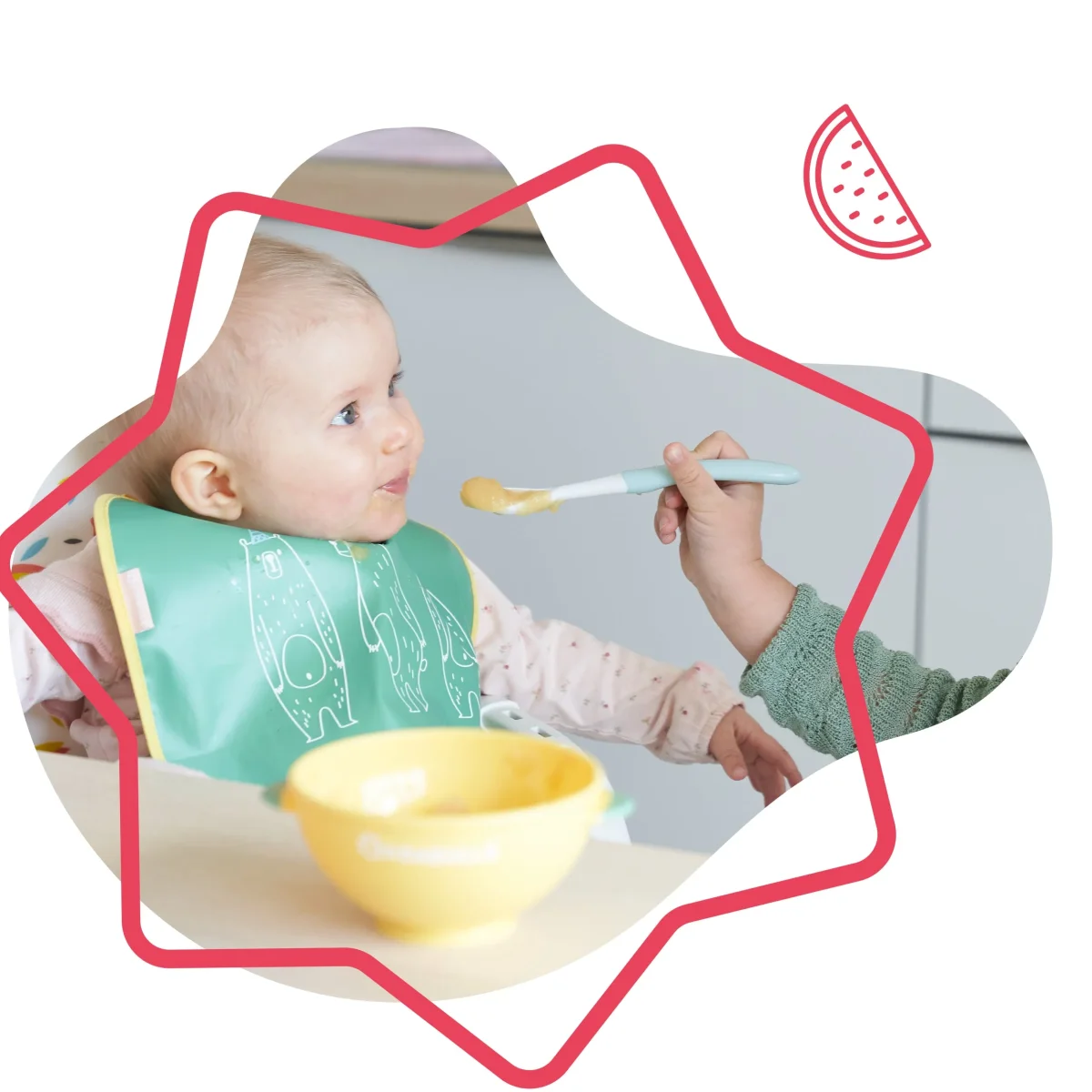 Le kit repas complet, coloré et ingénieux ! 5 bols de 330ml avec 5 couvercles hermétiques et 1 ventouse anti-dérapante 3 cuillères avec manche antidérapant Embout cuillère adapté aux petites bouches Passent au micro-ondes et au congélateur