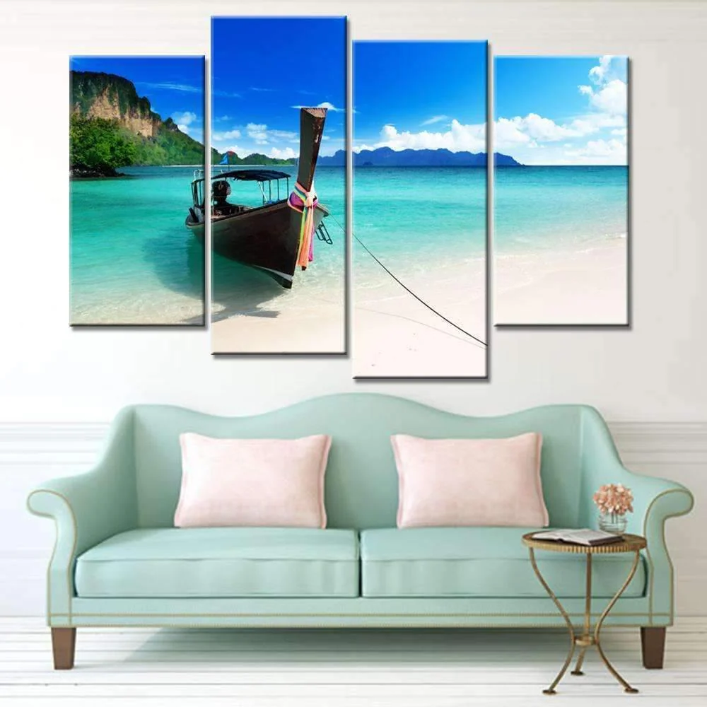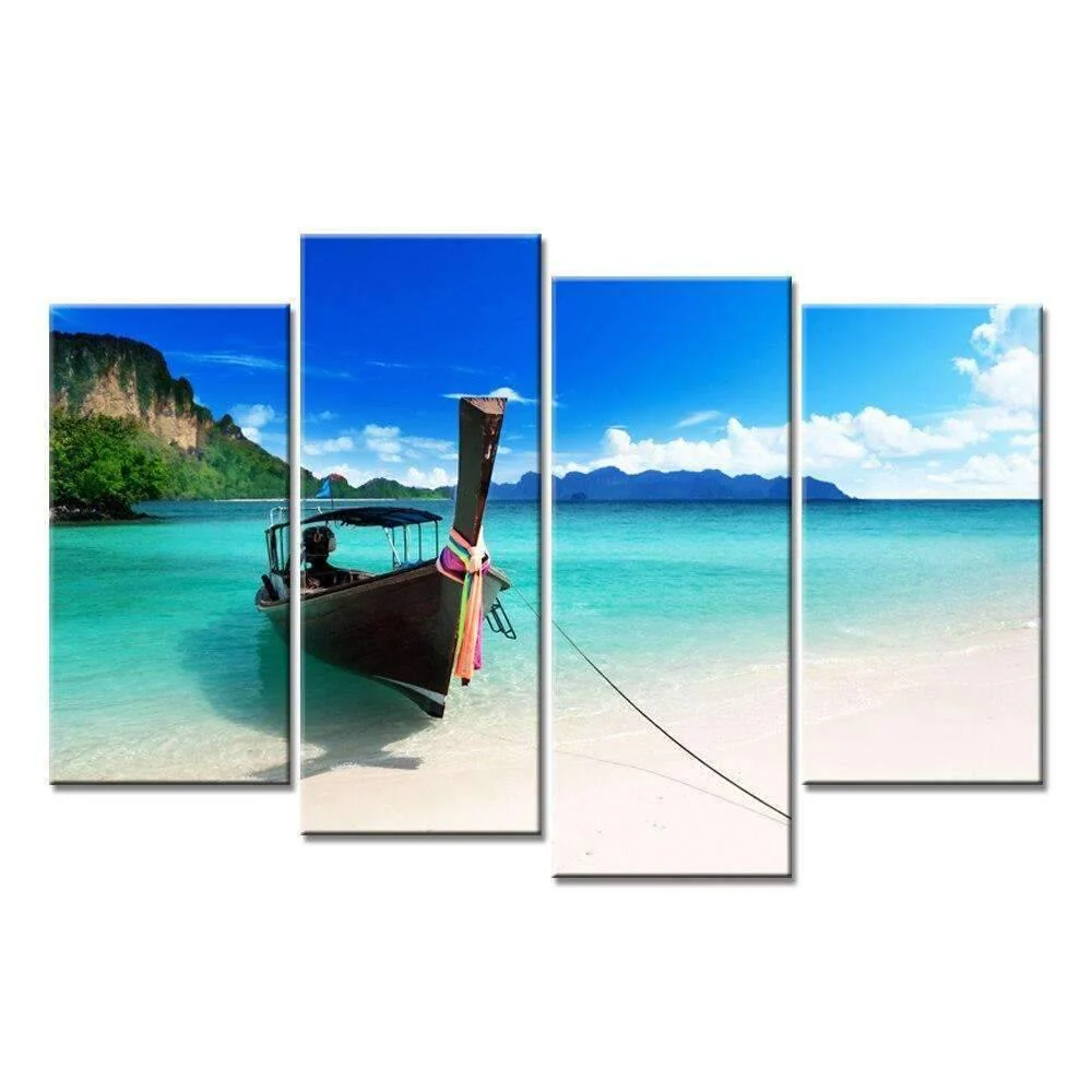 Tableau déco murale d’une embarcation à l’amarrage, dans un paysage tropical.