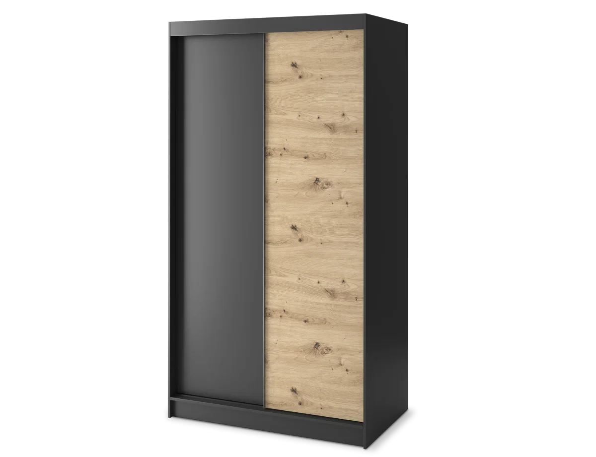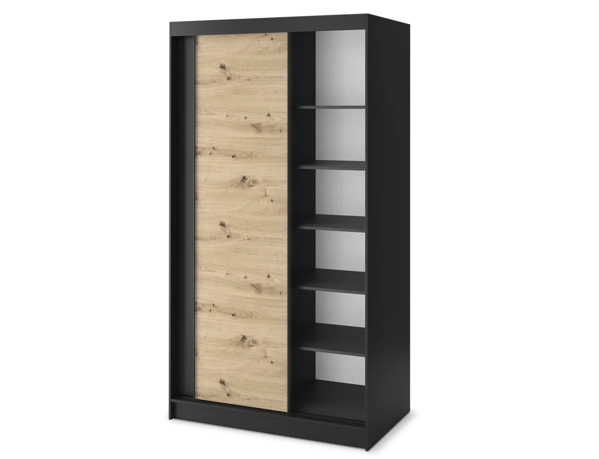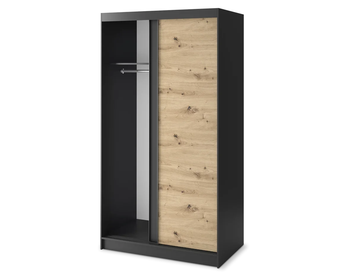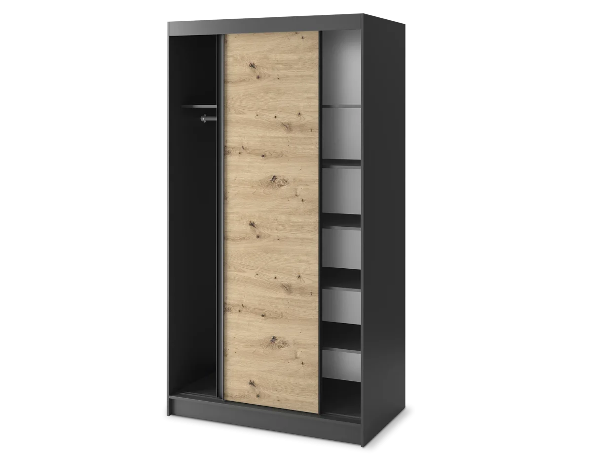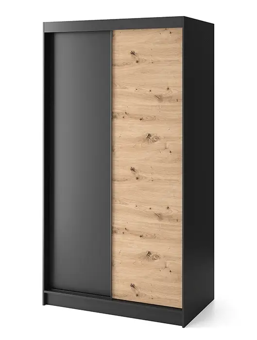Son association noir mat et chêne artisan apporte un contraste contemporain très recherché, idéal pour une chambre moderne, un dressing ou même une entrée design. Les façades sobres et graphiques renforcent son style minimaliste tout en conservant la chaleur du bois.