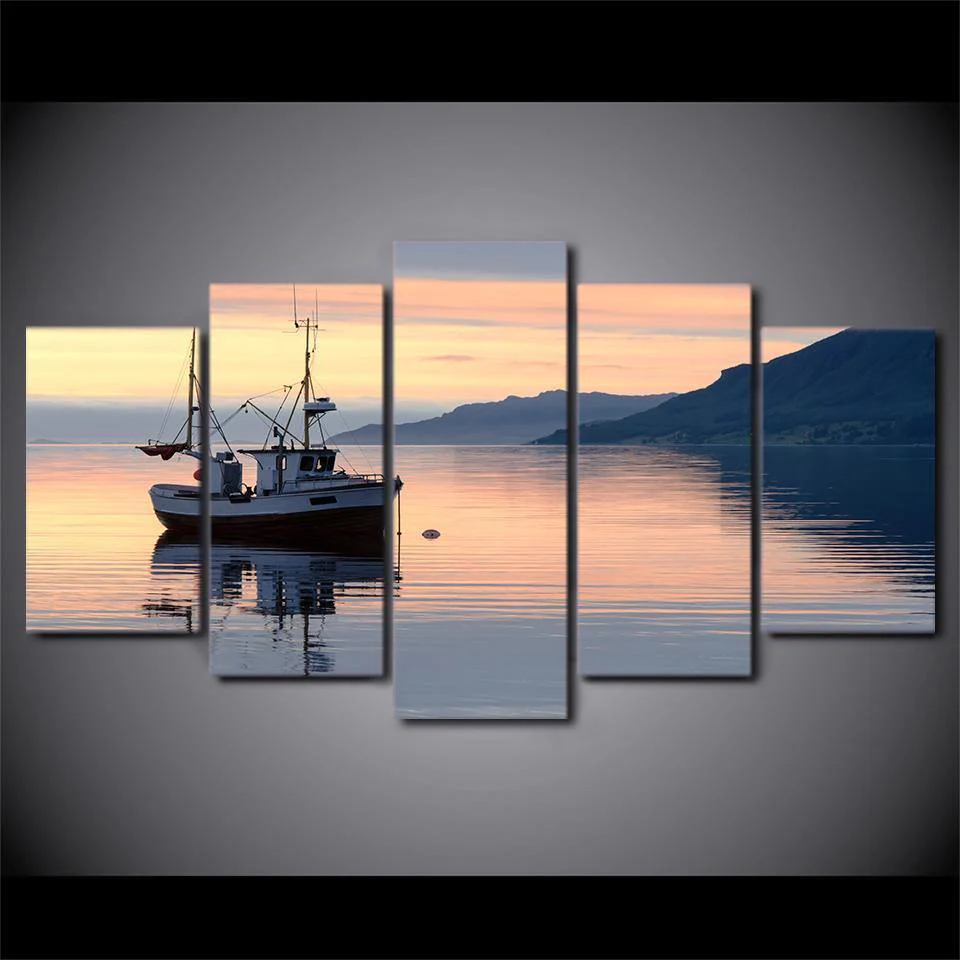 – Tableau déco murale d’un bateau de pêche au petit jour.