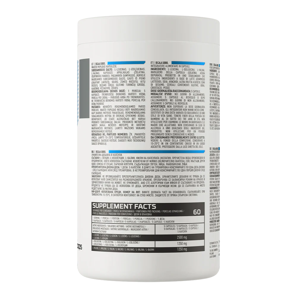 Le complément OstroVit BCAA 5000 mg est une formule ciblée pour les personnes actives et les sportifs qui souhaitent apporter à leur organisme des acides aminés à chaîne ramifiée (BCAA) dans un ratio optimal. Chaque portion fournit une association de leucine, isoleucine et valine, permettant de soutenir la synthèse musculaire, la réduction du catabolisme et la récupération après l’effort. La composition est volontairement simple, pour une assimilation rapide et efficace.