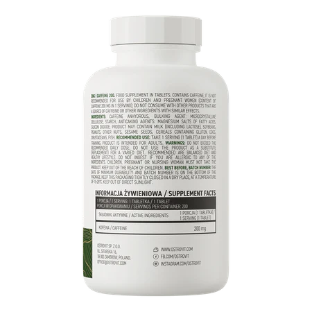 Caféine 200mg d’Ostrovit est un complément alimentaire puissant, conçu pour fournir un boost d’énergie et de concentration grâce à une dose précise de caféine par gélule.