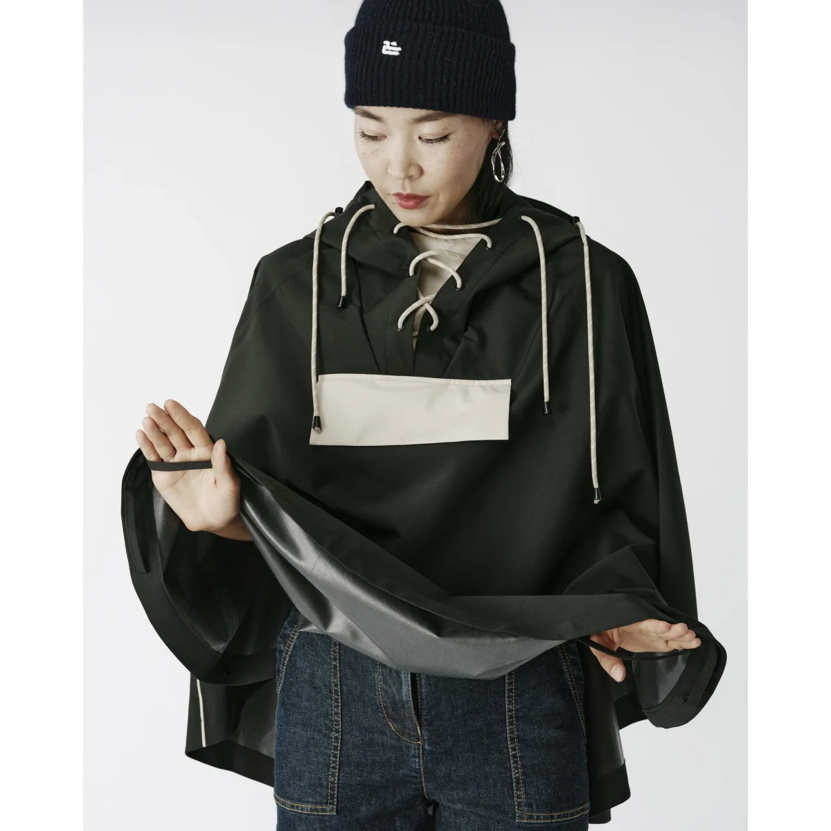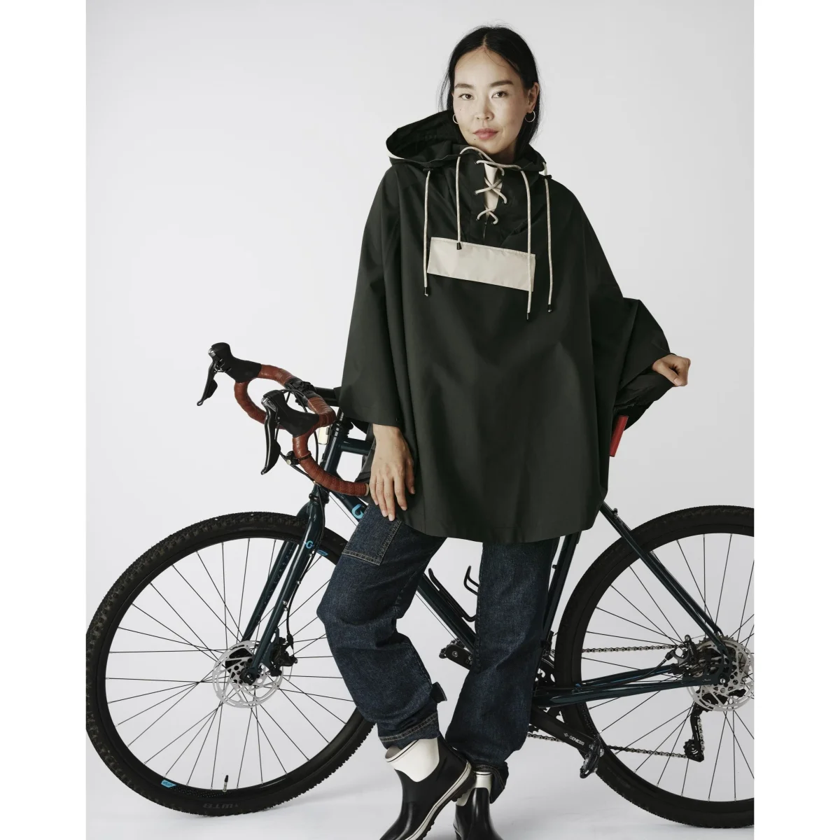 Optez pour LOU V02, un poncho imperméable qui allie fonctionnalité, style et durabilité pour toutes les femmes qui font du vélo.