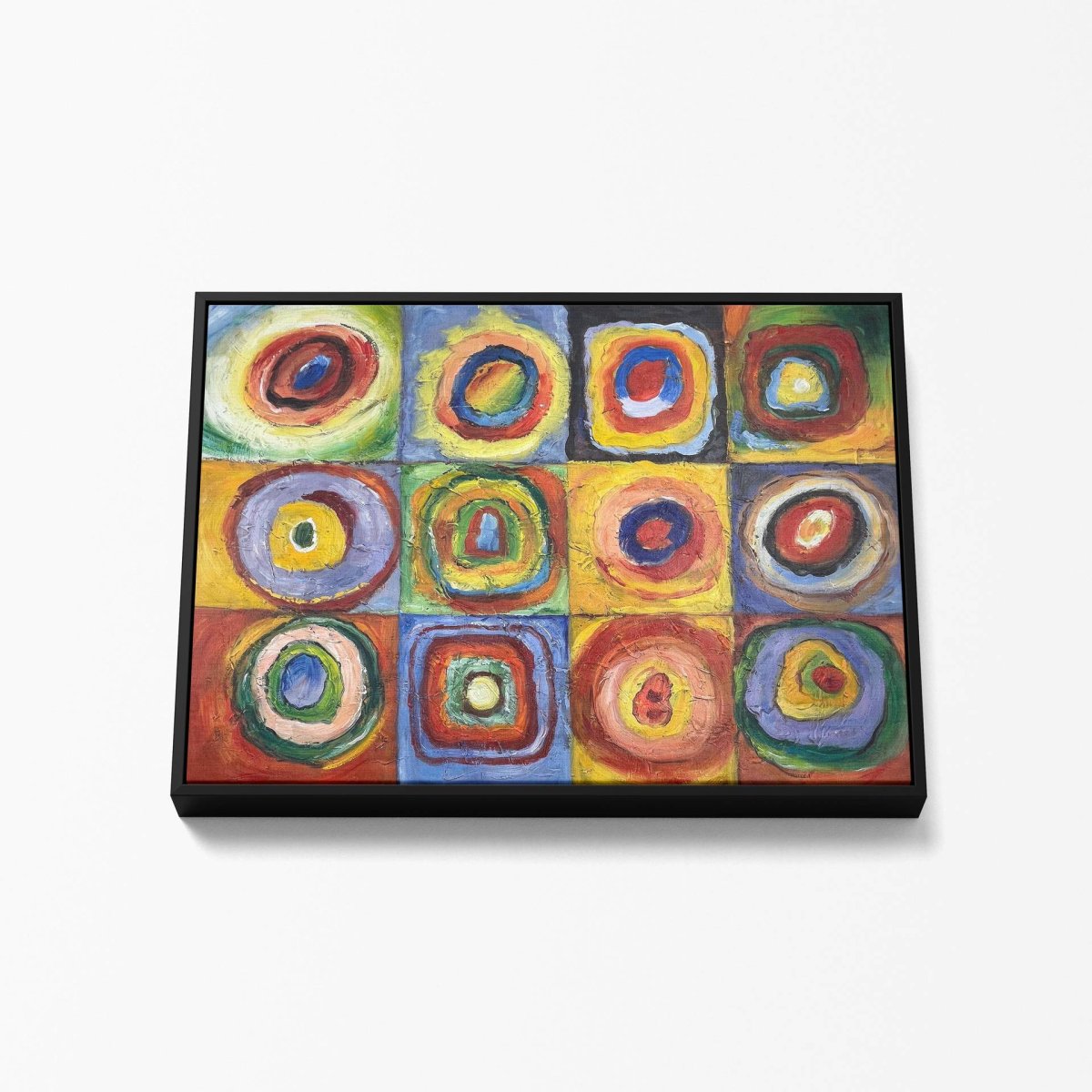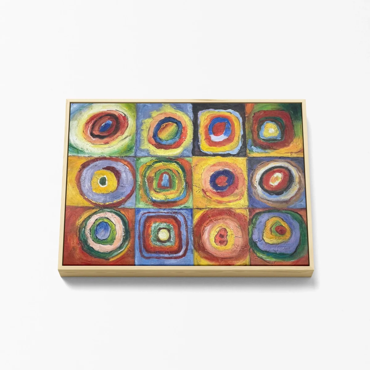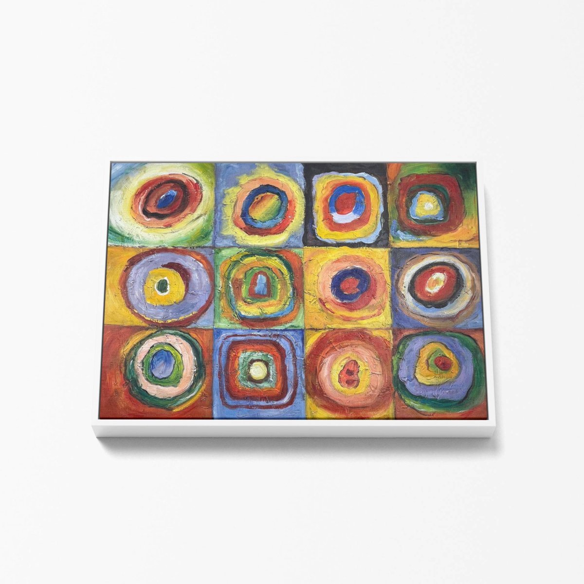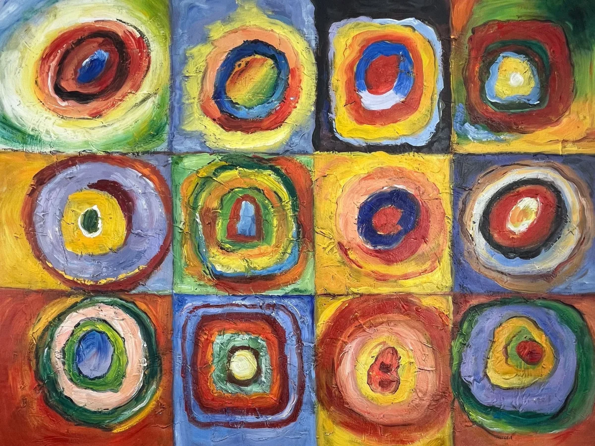 « Étude de Couleur : Carrés avec Cercles Concentriques » est une exploration vibrante et colorée de la théorie des couleurs par Wassily Kandinsky, un des pionniers de l’art abstrait. Cette reproduction à l’huile, peinte à la main sur une toile de 80×60 cm en format carré, capture l’essence de l’expérimentation de Kandinsky avec la forme et la couleur. Chaque carré contient plusieurs cercles concentriques, chacun peint dans des couleurs différentes, créant un effet visuel dynamique qui attire et retient le regard.