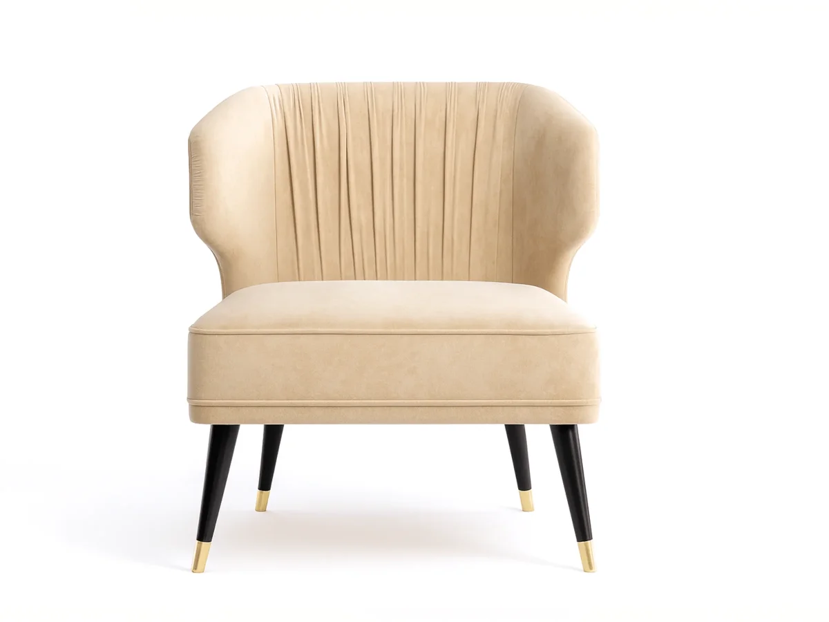 Les pieds fuselés noirs avec embouts dorés ajoutent une touche chic et contemporaine, faisant de ce fauteuil un véritable atout déco.