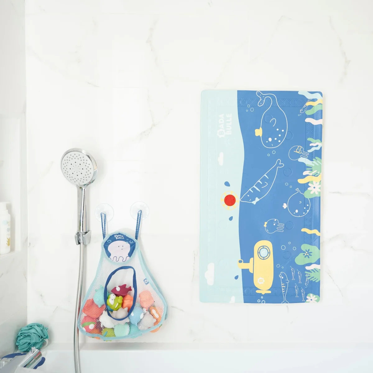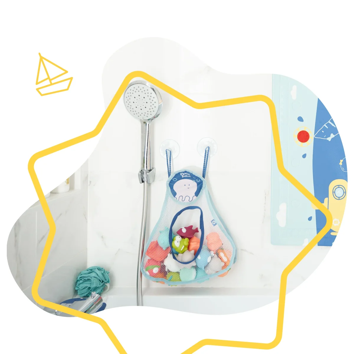 Un rangement hygiénique pour les jouets de bain ! 2-en-1 : pour ranger et sécher les jouets Grande contenance Large ouverture centrale 2 ventouses puissantes Filet respirant