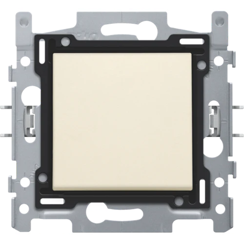 Set de finition pour interrupteur ou bouton-poussoir simple, cream. L’enjoliveur est entouré d’un bord plat muni aux 4 angles d’une ouverture rectangulaire dans laquelle se trouve un crochet de sécurité multiposition. La partie saillante de l’enjoliveur fait en sorte qu’en cas de plâtrage peu soigneux, la plaque de recouvrement puisse toujours être fixée bien à plat contre le mur grâce aux crochets de sécurité. Ce système fonctionne dans deux sens : si le boîtier d’encastrement dépasse du plâtrage, les crochets de sécurité multiposition compensent un jeu de 1 à 1,2 mm ; si le boîtier d’encastrement est enfoncé trop profondément dans le plâtrage, les crochets de sécurité peuvent compenser un jeu de 1,8 mm max. Le bord plat qui entoure l’enjoliveur comprend également 4 ouvertures rondes qui assurent le positionnement correct de la plaque de recouvrement par rapport à l’enjoliveur. Après le montage de l’ensemble (plaque de recouvrement, set de finition et mécanisme), aucune partie métallique n’est visible grâce au bord plat sur l’enjoliveur.