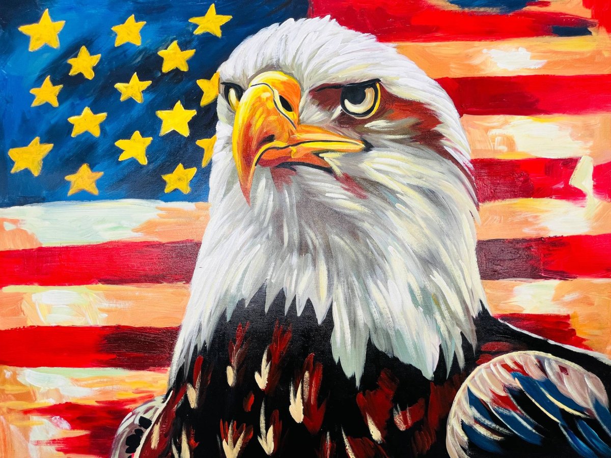 - Palette de Couleurs : Les couleurs iconiques du drapeau – rouge, blanc et bleu – utilisées pour créer un contraste saisissant avec la teinte naturelle de l’aigle, accentuant ainsi la symbolique patriotique de l’œuvre.