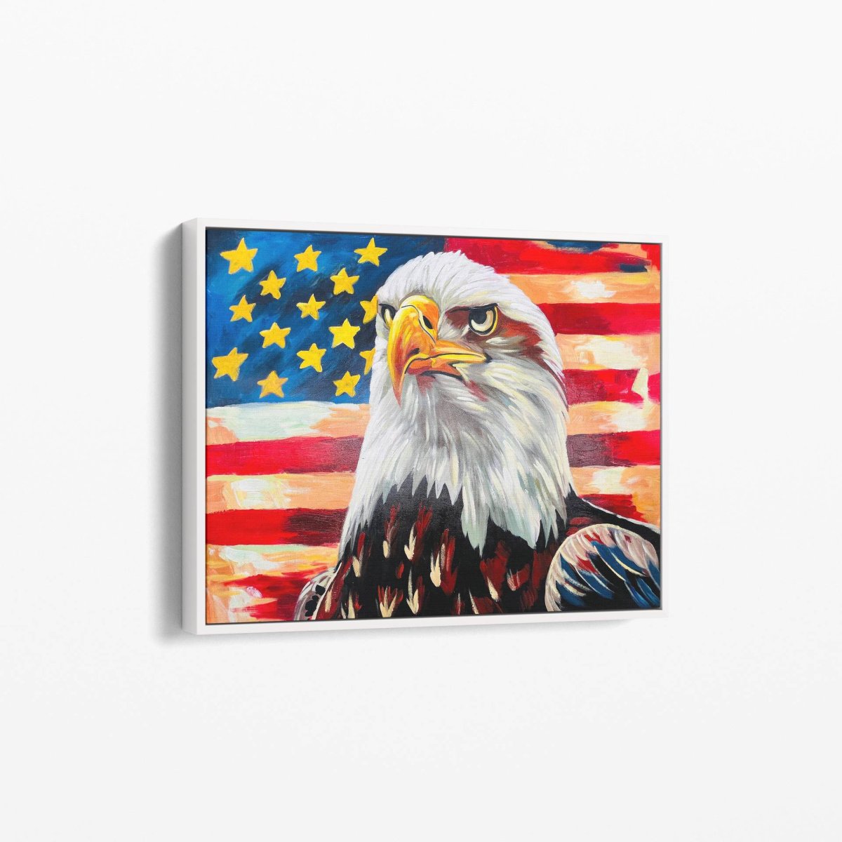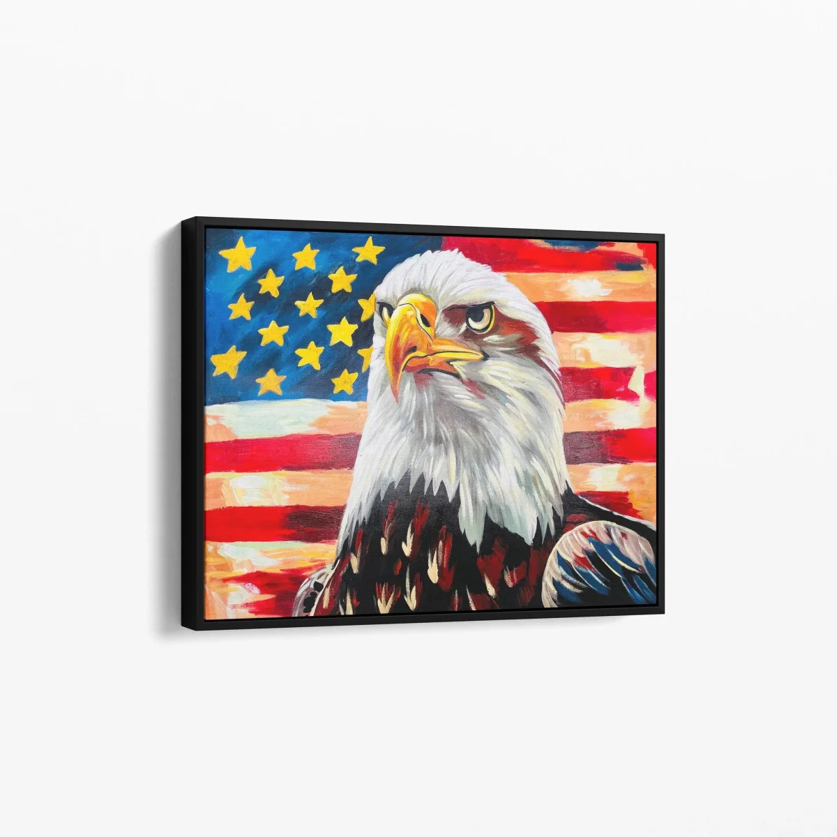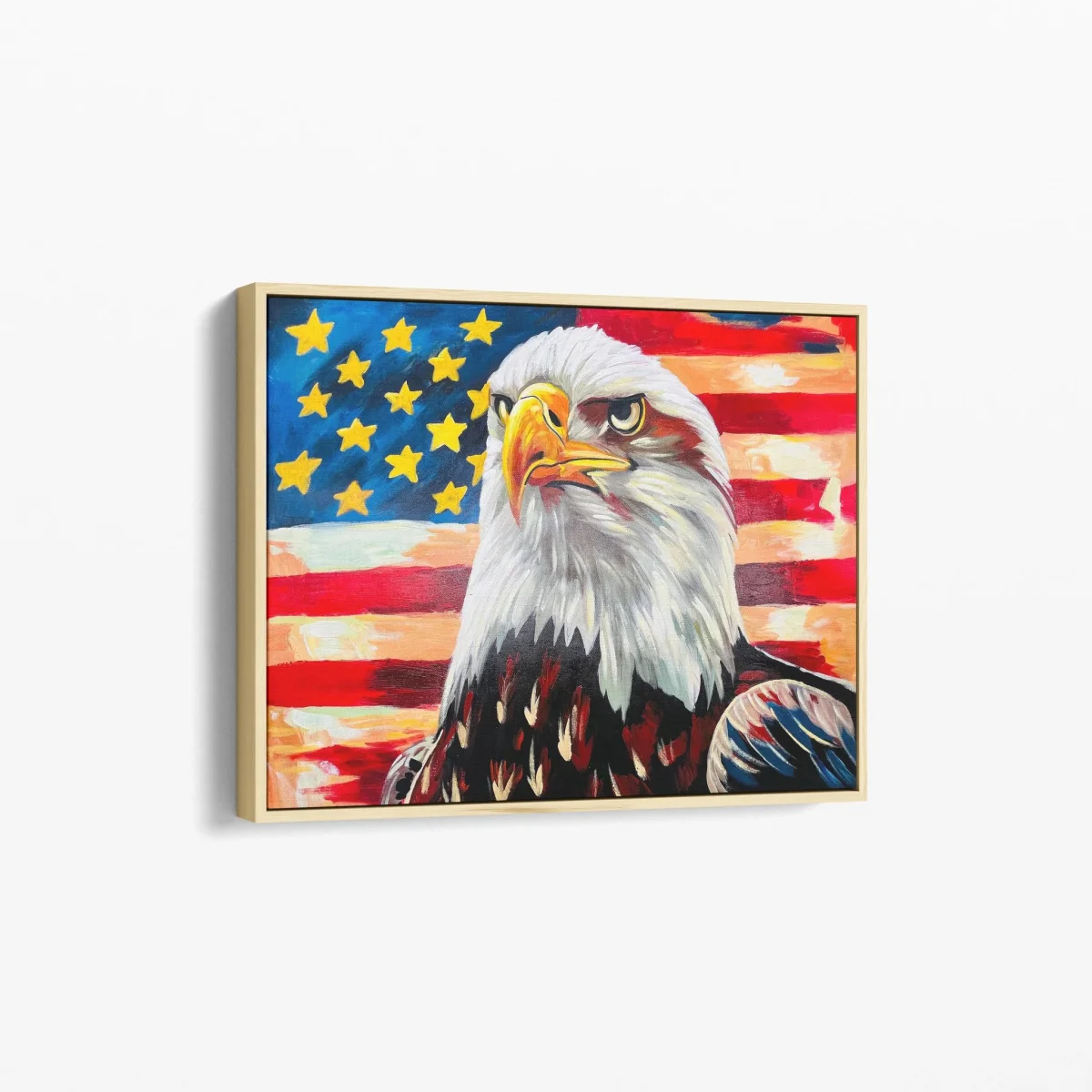 - Technique : Des techniques de peinture précises et détaillées pour capturer la texture des plumes de l’aigle et le mouvement ondoyant du drapeau, enrichissant la scène de réalisme et de dynamisme.