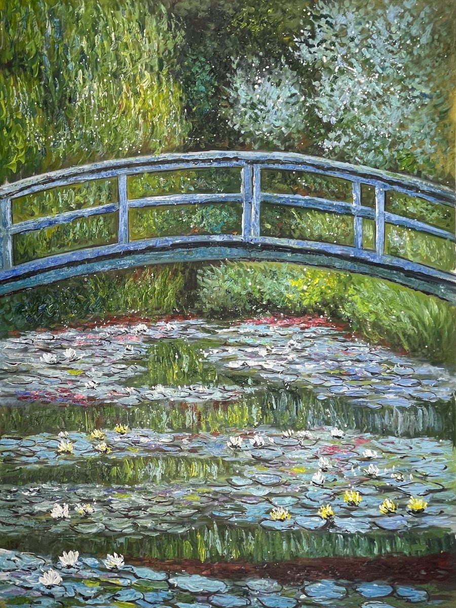 - Technique : Peinture à l’huile sur toile, appliquée avec des méthodes qui respectent le style impressionniste de Monet pour capturer les effets de lumière sur l’eau et la flore.