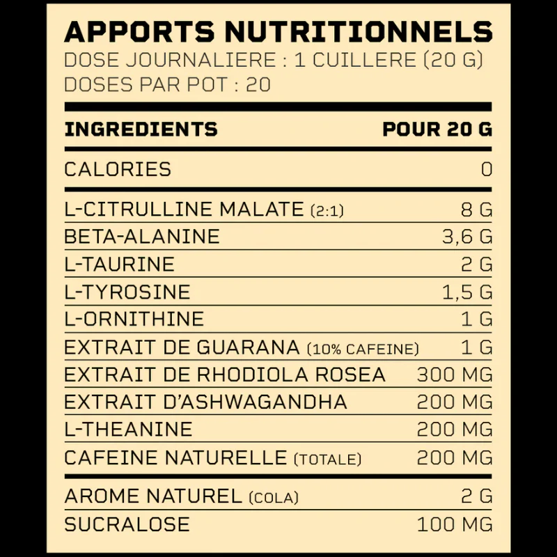 Sa formulation unique s’appuie sur 59 études scientifiques rigoureuses pour offrir une synergie parfaite entre performance, sécurité et plaisir gustatif. Contrairement aux pre-workouts conventionnels concentrant uniquement sur la caféine, cette formule élaborée contient 17,9g d’ingrédients actifs par dose, soit jusqu’à 6 fois plus que la concurrence.