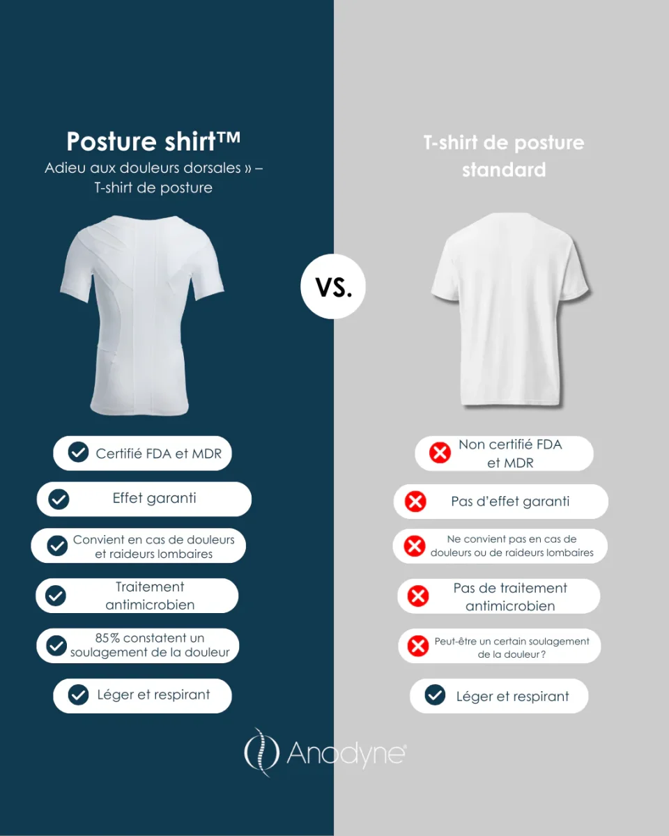 Souffrez-vous régulièrement de douleurs ou de tensions ? Alors ce t-shirt pourrait être une solution pour vous. Ce n’est pas seulement un t-shirt classique : le Posture Shirt™ d’Anodyne® est breveté, enregistré comme dispositif médical et est le seul produit du genre sur le marché, un effet bien documenté sur la douleur et la tension.