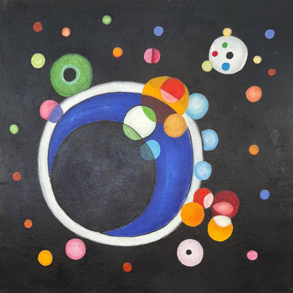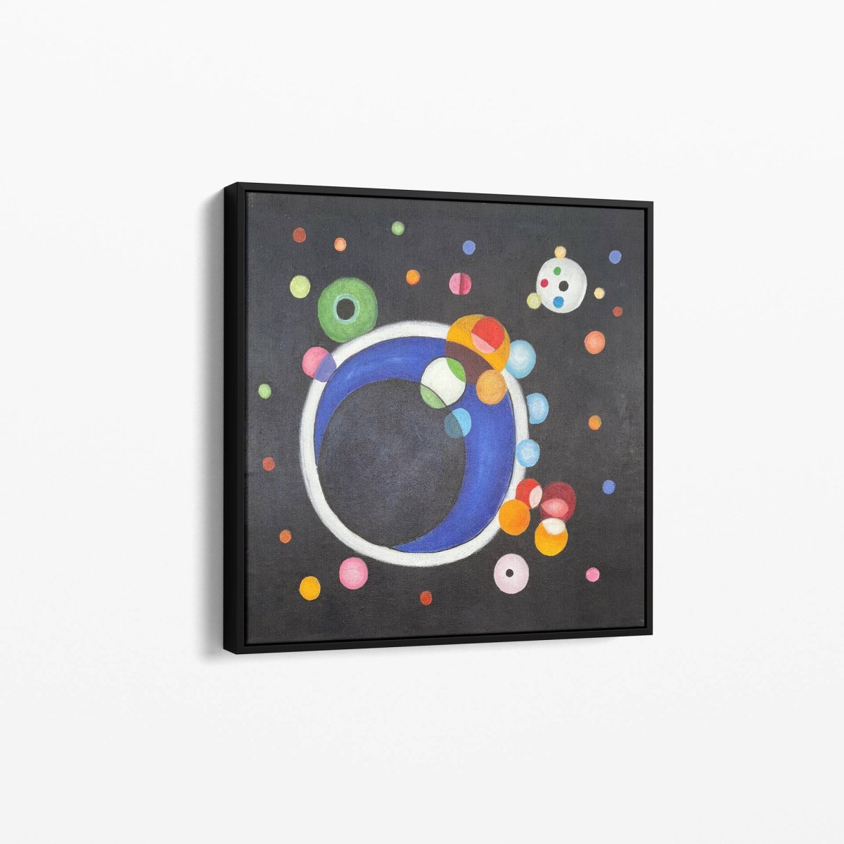 « Plusieurs Cercles » est une œuvre emblématique de Wassily Kandinsky, un pionnier de l’abstraction qui a exploré la profondeur et la dynamique des formes géométriques. Cette reproduction à l’huile, peinte à la main sur une toile de 70×70 cm en format horizontal, capte l’essence de la composition originale de Kandinsky, où de multiples cercles de différentes tailles et couleurs flottent sur un fond sombre, créant une impression de mouvement et de profondeur cosmique.