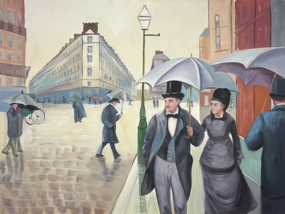 - Technique : Peinture à l’huile sur toile, mettant en avant le talent des artistes pour capturer la lumière et l’humidité d’un jour de pluie.