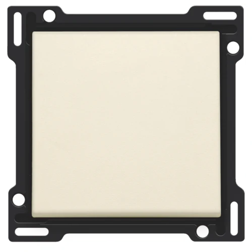 Set de finition pour interrupteur ou bouton-poussoir simple, cream. L’enjoliveur est entouré d’un bord plat muni aux 4 angles d’une ouverture rectangulaire dans laquelle se trouve un crochet de sécurité multiposition. La partie saillante de l’enjoliveur fait en sorte qu’en cas de plâtrage peu soigneux, la plaque de recouvrement puisse toujours être fixée bien à plat contre le mur grâce aux crochets de sécurité. Ce système fonctionne dans deux sens : si le boîtier d’encastrement dépasse du plâtrage, les crochets de sécurité multiposition compensent un jeu de 1 à 1,2 mm ; si le boîtier d’encastrement est enfoncé trop profondément dans le plâtrage, les crochets de sécurité peuvent compenser un jeu de 1,8 mm max. Le bord plat qui entoure l’enjoliveur comprend également 4 ouvertures rondes qui assurent le positionnement correct de la plaque de recouvrement par rapport à l’enjoliveur. Après le montage de l’ensemble (plaque de recouvrement, set de finition et mécanisme), aucune partie métallique n’est visible grâce au bord plat sur l’enjoliveur.