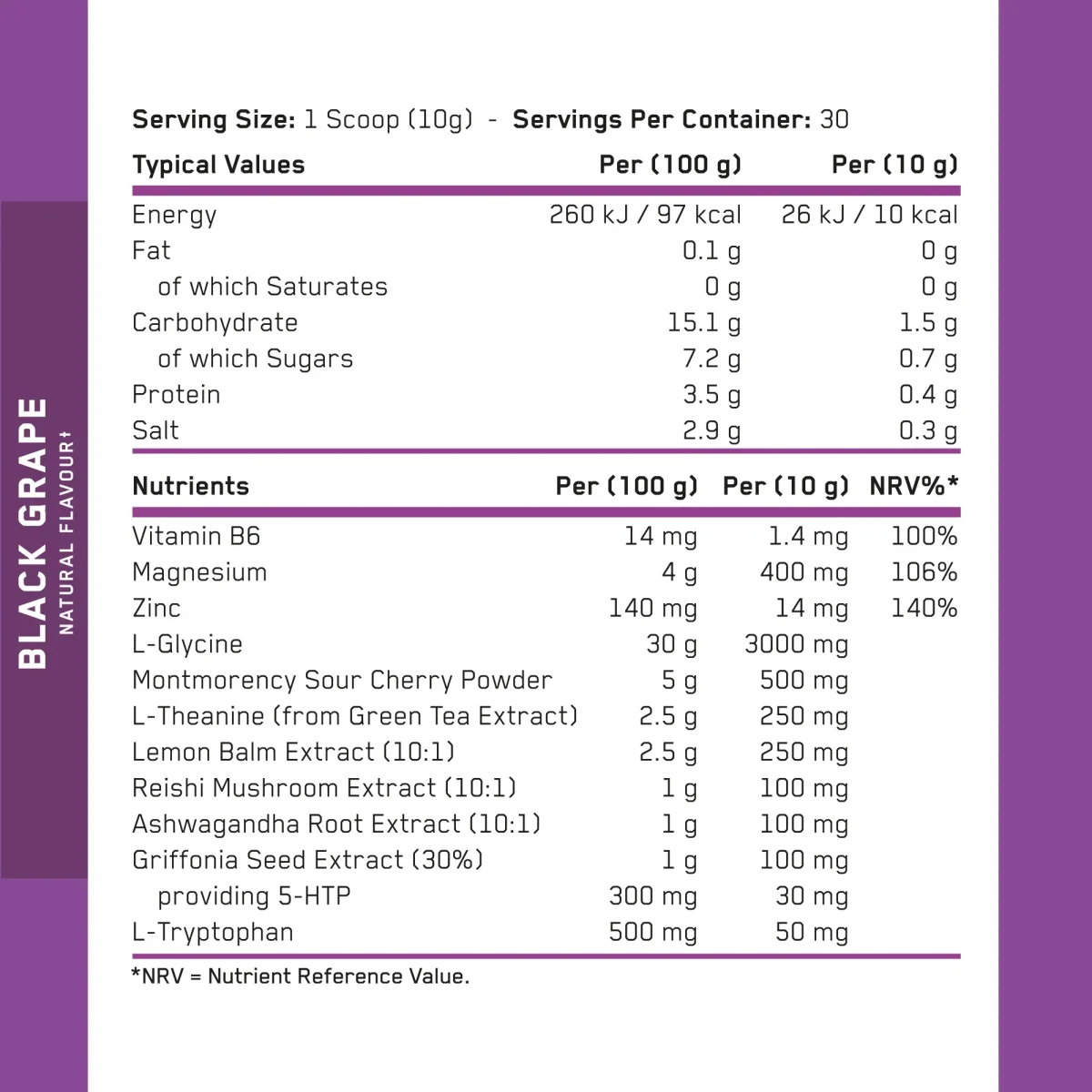 Dosage recommandé : Mélanger 1 mesure (10g) dans 200-300ml d’eau tiède ou froide, 30 à 60 minutes avant le coucher.