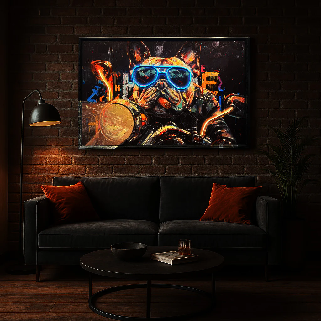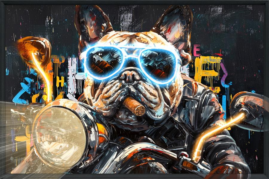 Ajoutez une touche rebelle et audacieuse à votre espace avec ce tableau Bulldog Biker. L’œuvre met en scène un bulldog imposant, vêtu d’une veste en cuir, portant des lunettes LED bleues, et fumant un cigare tout en chevauchant une moto.