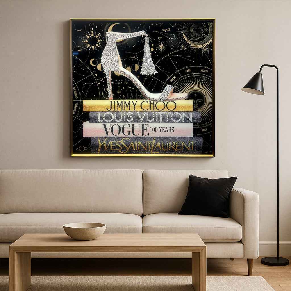 L’escarpin diamanté, véritable pièce maîtresse de la composition, brille comme une constellation au milieu de ce ciel nocturne parsemé de symboles célestes et de lignes astrologiques dorées. Encadrée dans un cadre doré fin, cette création contemporaine illustre parfaitement la rencontre entre le glamour de la haute couture et le mystère de l’univers, parfait pour sublimer une chambre ou un salon, un bureau ou une boutique.
