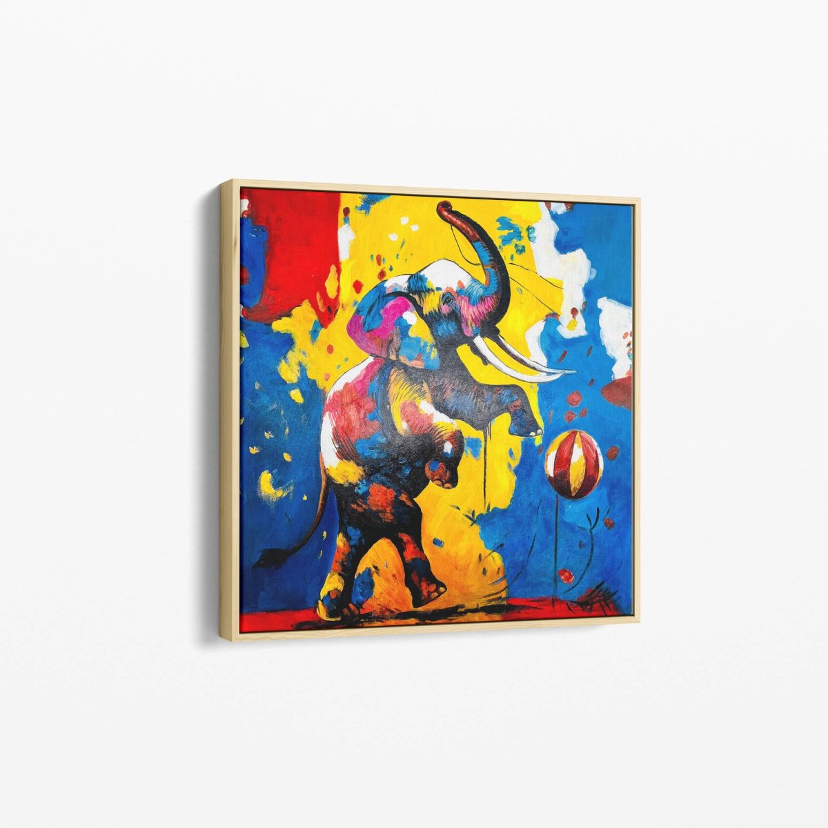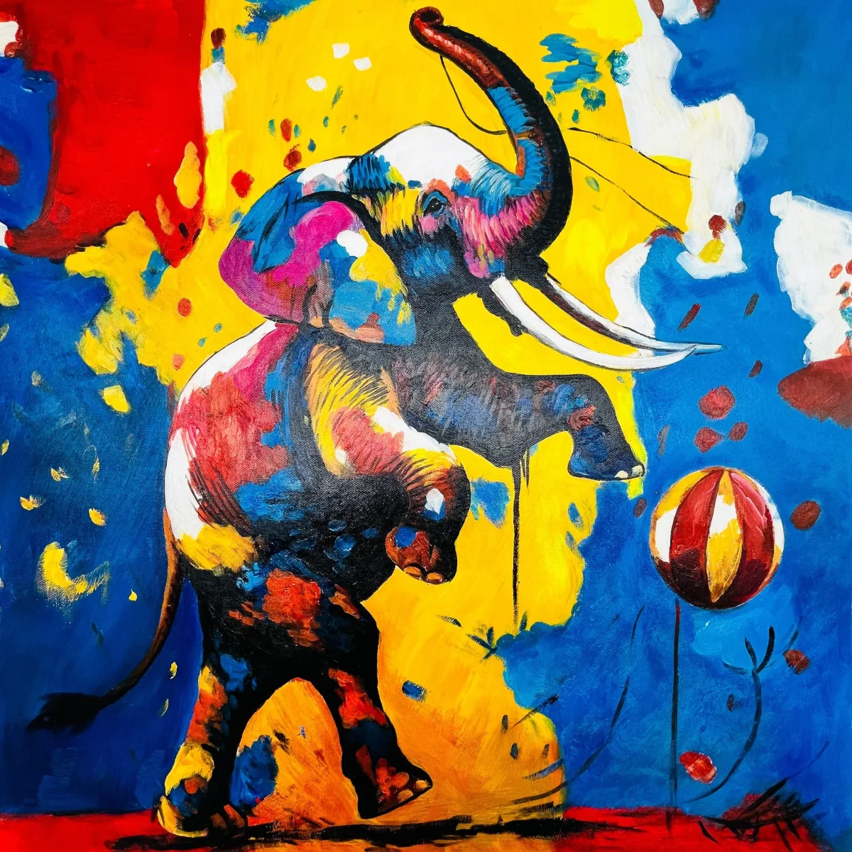 - Thème : Un éléphant de cirque capturé dans un moment de bonheur, jouant avec une balle dans une ambiance festive.