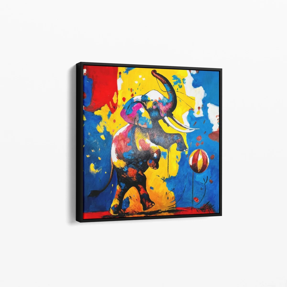 « Joie Circassienne » est une œuvre d’art pétillante qui capture l’essence ludique et la magie du cirque à travers l’image d’un éléphant joyeux jonglant avec une balle colorée. Dans un style pop art éclatant, cette peinture utilise des couleurs primaires vives pour donner vie à la scène, évoquant les souvenirs d’enfance des spectacles de cirque et la joie qu’ils apportent. Parfait pour les amateurs d’art vibrant et ceux qui cherchent à ajouter une touche de gaieté et de nostalgie à leur espace, ce tableau est un hommage à l’amusement et à l’émerveillement.