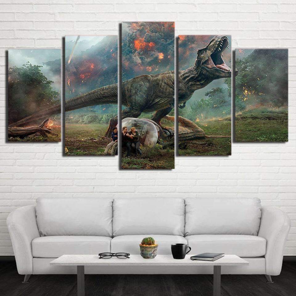 – Tableau, déco murale de personnages faces à un T-Rex à l’époque du Jurassique.