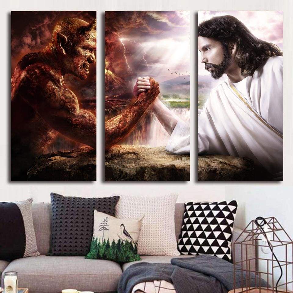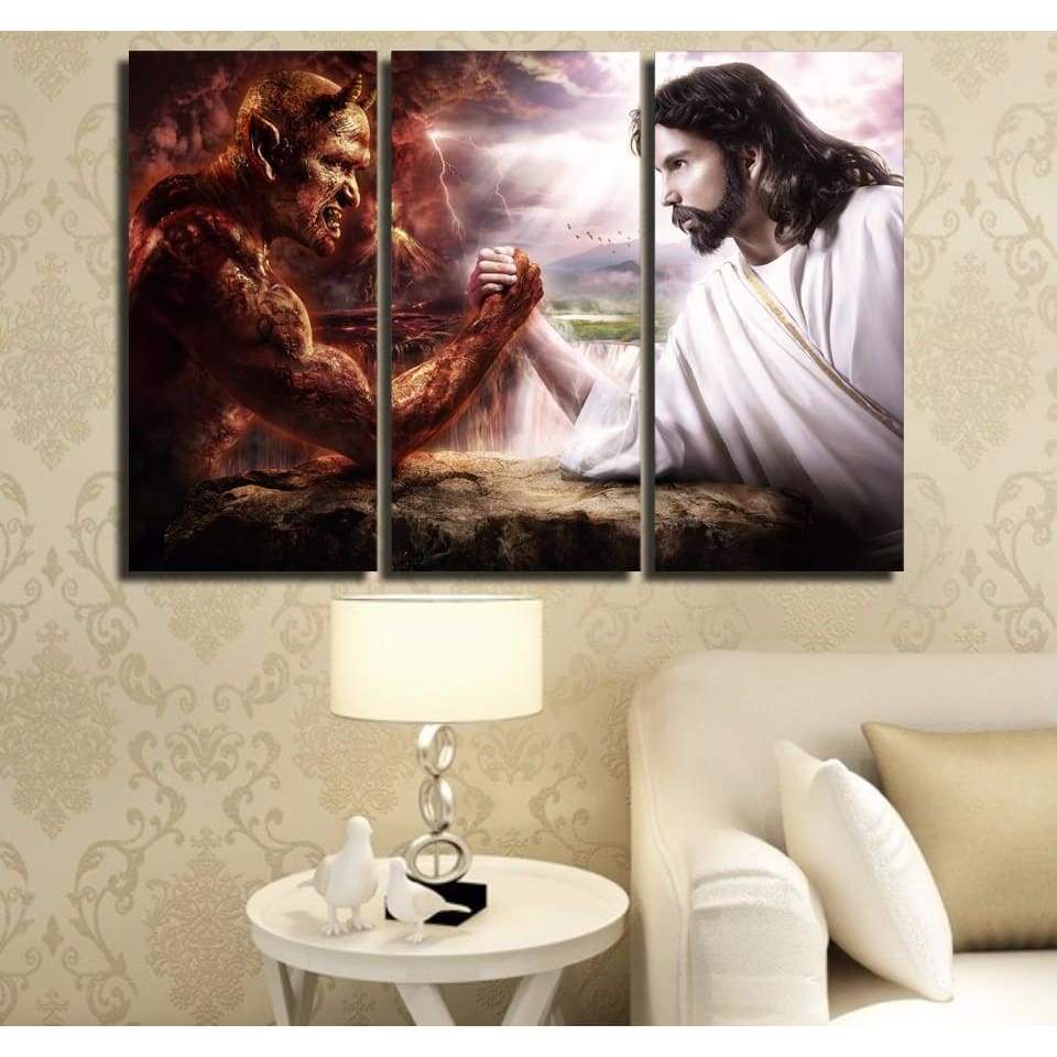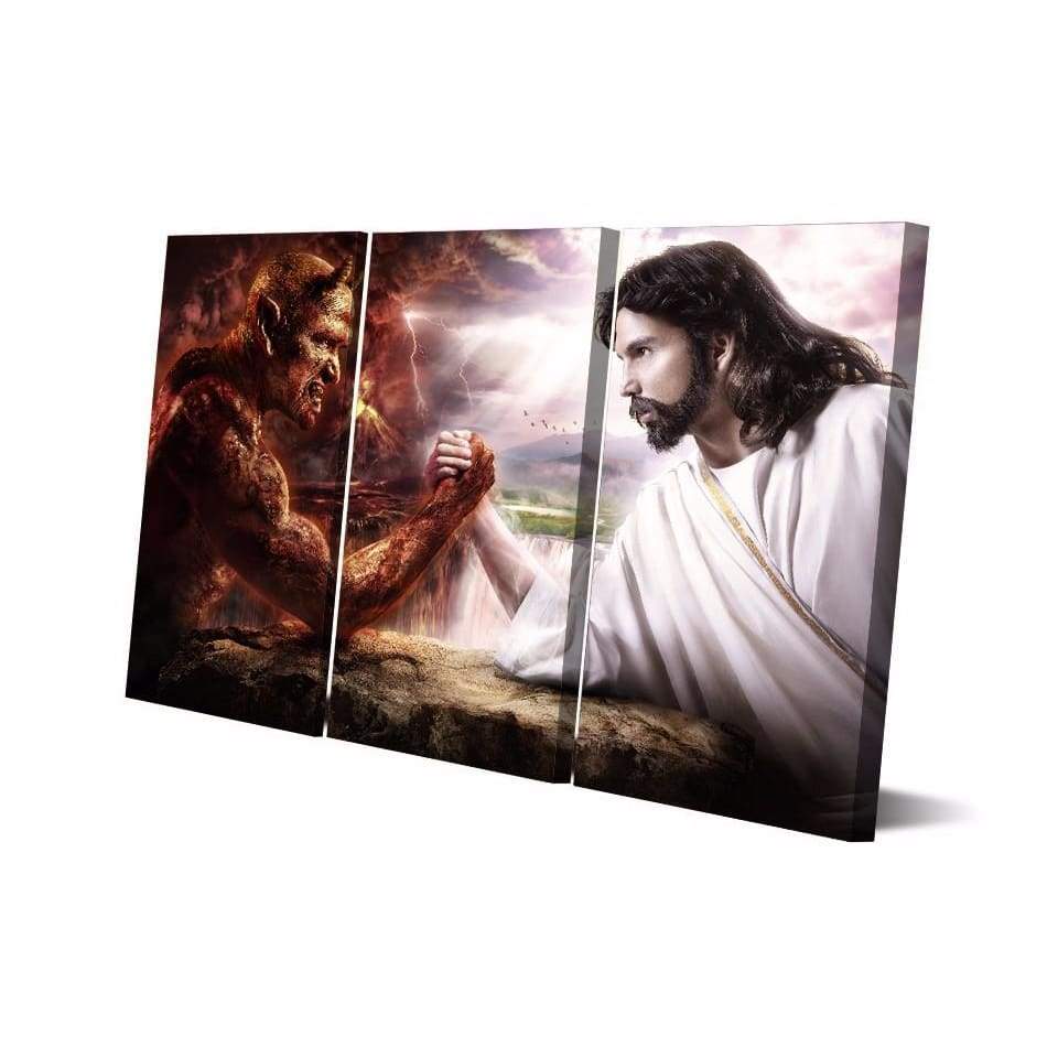 – Tableau, déco murale d’un bras de fer entre Jésus-Christ et le diable, représentant le bien contre le mal.