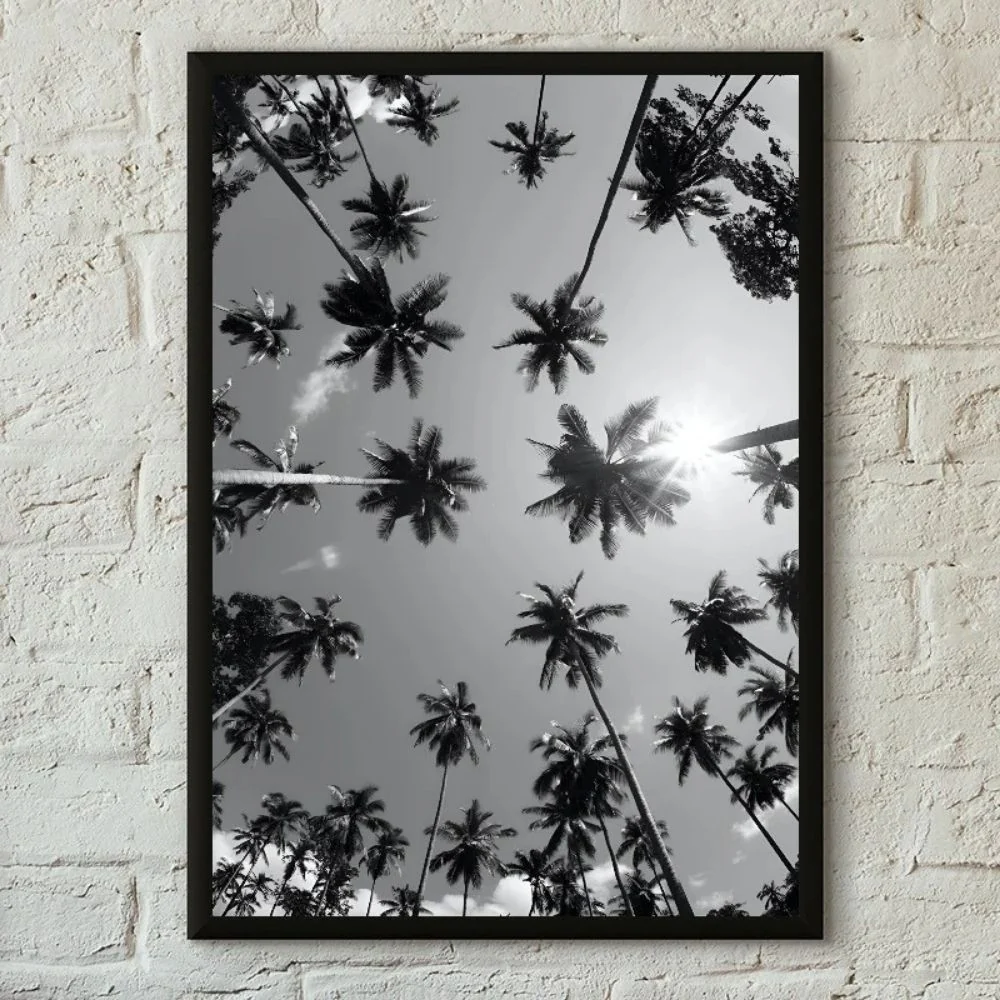 Laissez-vous envoûter par ce tableau photographie palmiers en contre-plongée noir et blanc, une impression sur toile pensée pour ajouter du cachet à votre déco.