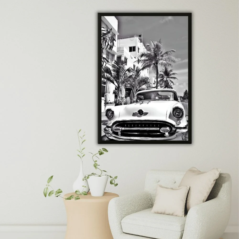 Amateur de voiture rétro ? Découvrez notre tableau photographie voiture vintage à Miami, une impression sur toile noir et blanc qui attire le regard.