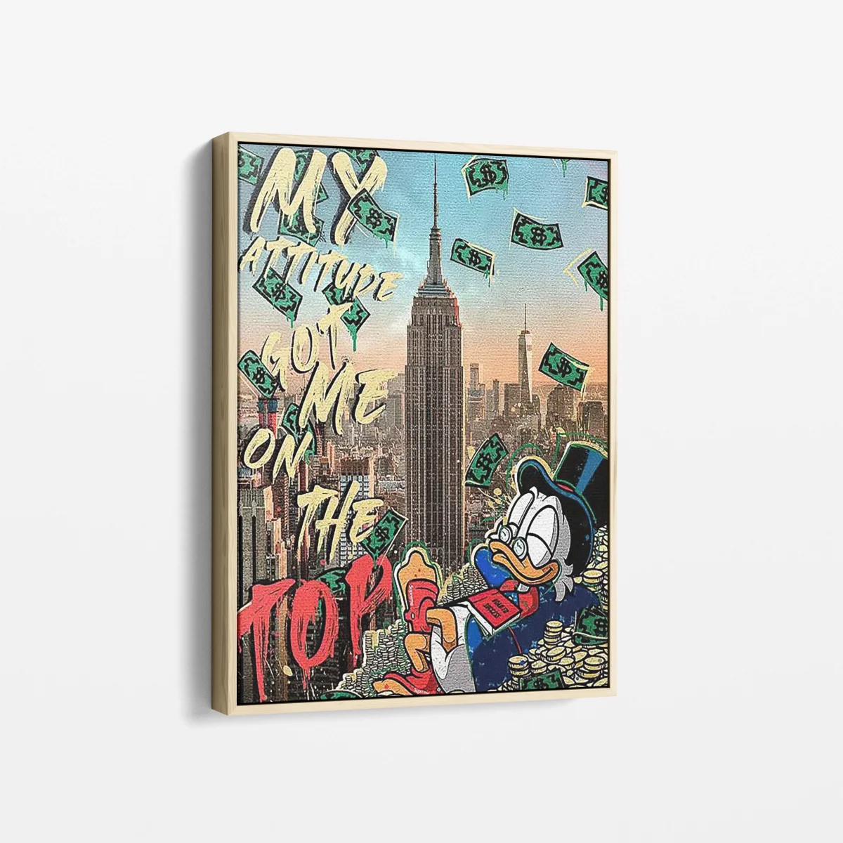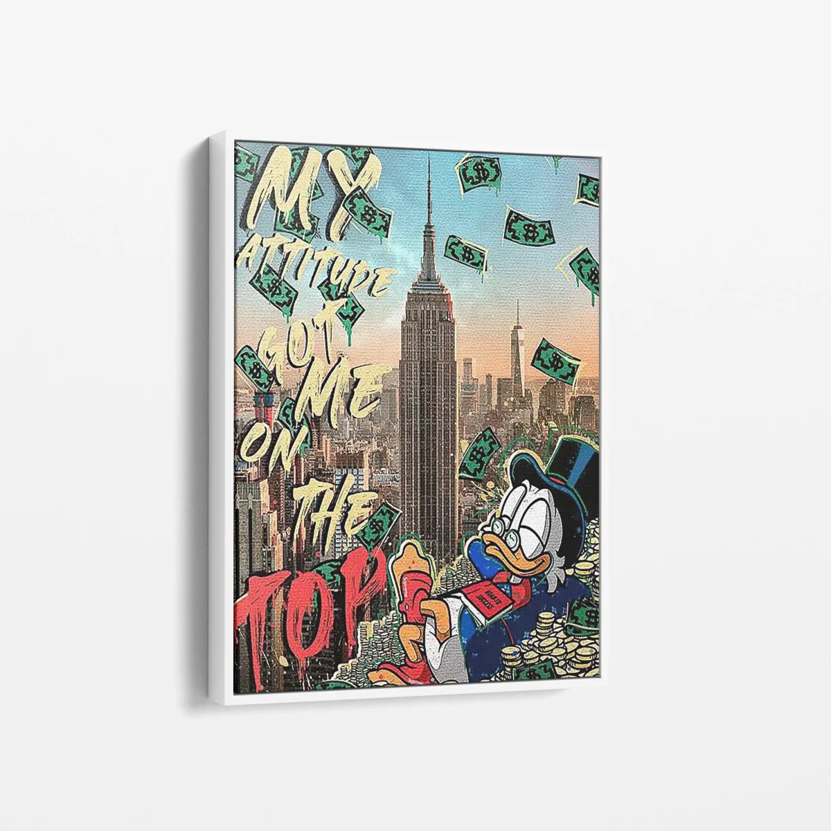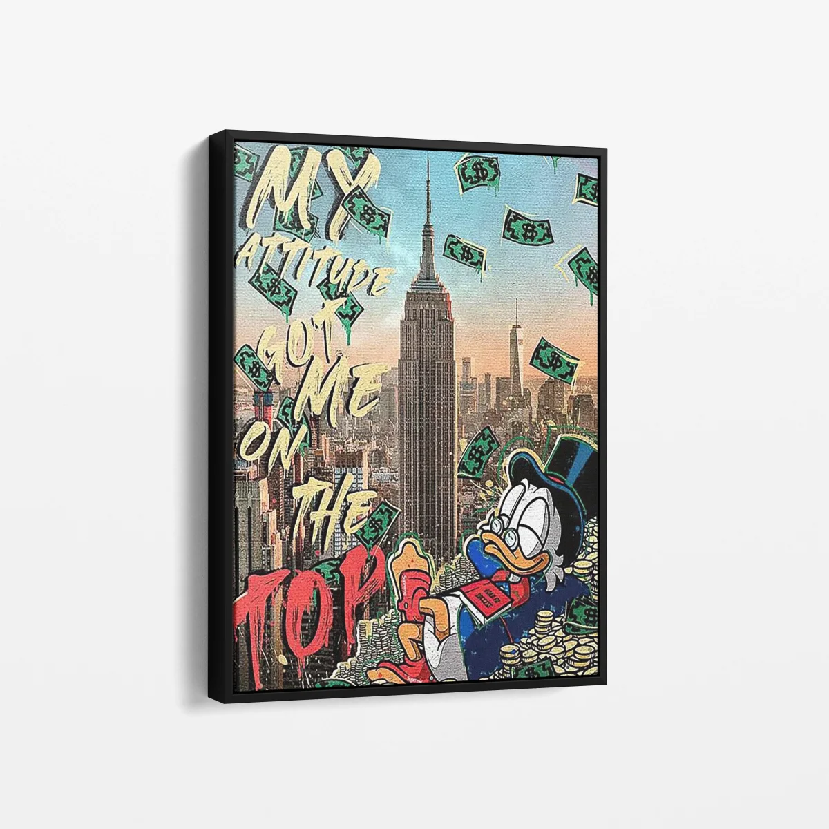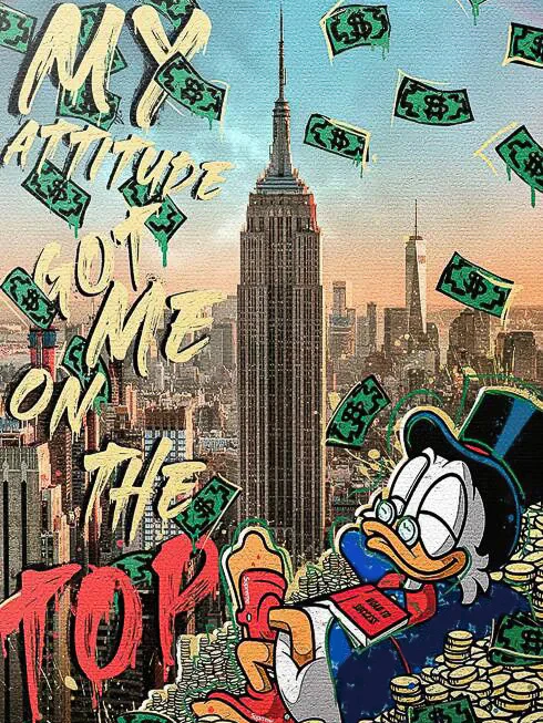 Affirmez votre succès avec « Attitude au Sommet », une œuvre qui incarne la détermination et la conquête dans un style pop art saisissant. Ce tableau met en scène un personnage iconique au sommet de l’Empire State Building, entouré de billets de banque, avec un message clair : c’est l’attitude qui mène au sommet. Imprimé sur toile et tendu sur un châssis en bois, « Attitude au Sommet » est une pièce d’art audacieuse et inspirante, parfaite pour insuffler une dose de motivation et de grandeur à votre espace.