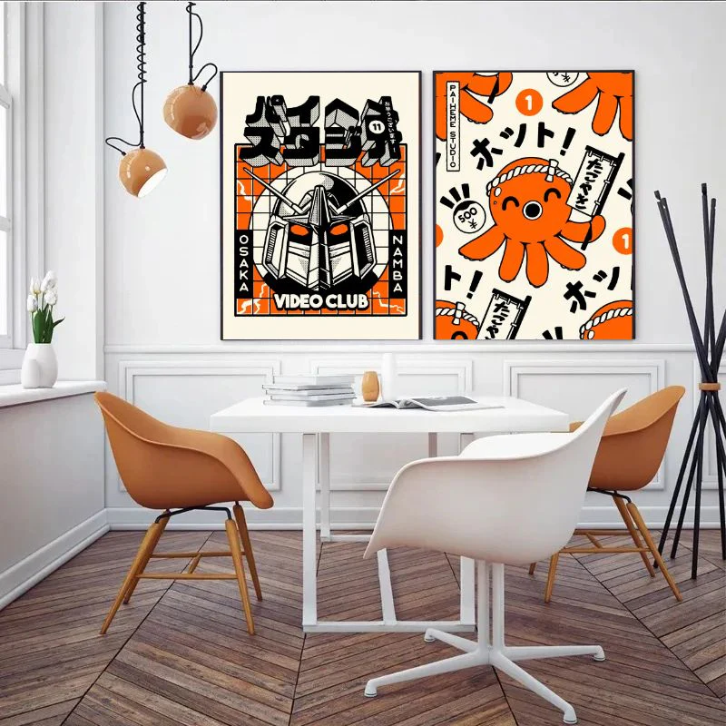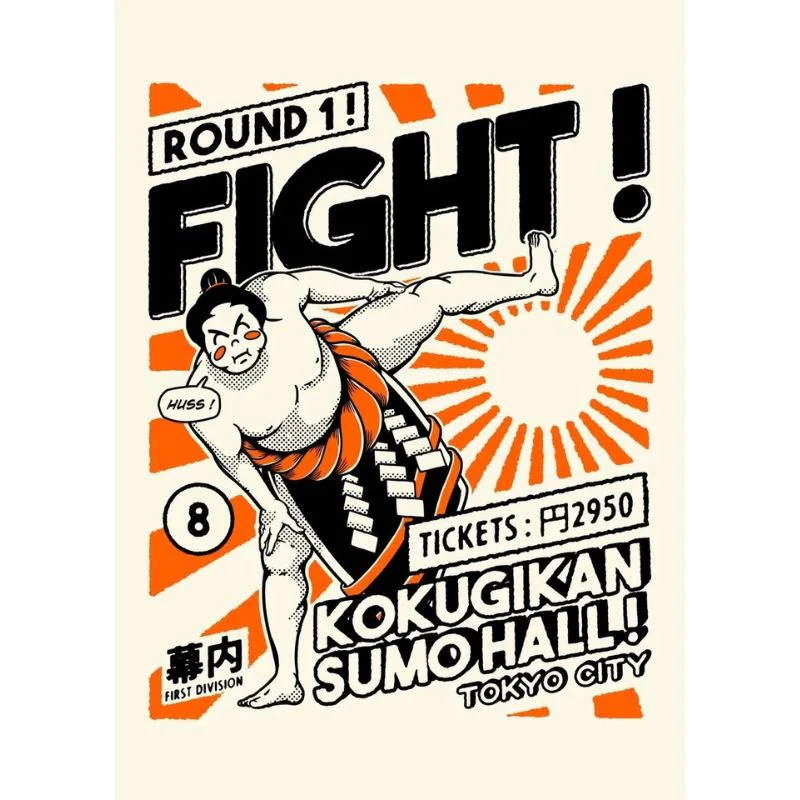 Cette reproduction de peinture sur toile, disponible en plusieurs modèles, met en avant des éléments iconiques de la pop culture japonaise, notamment un combattant de sumo ou encore la pieuvre takoyaki, le tout dans une palette de couleurs orangées qui illuminera votre espace.
