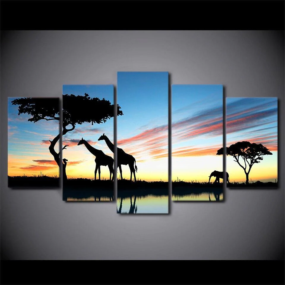 – Tableau, déco murale de girafes et d’un éléphant dans la savane africaine.