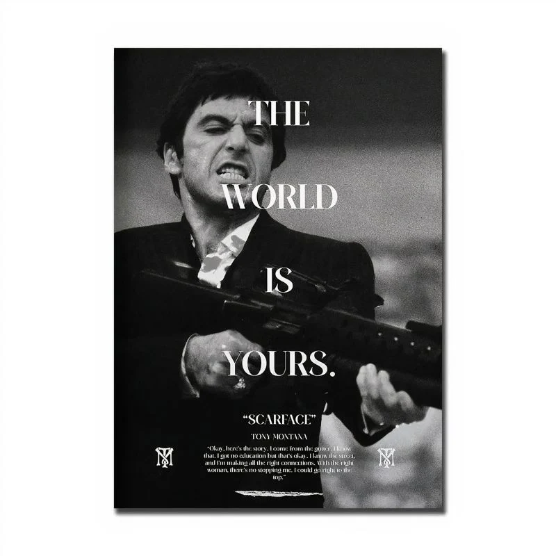 Laissez-vous séduire par ce tableau Scarface, une pièce décorative inspirée de l’affiche du légendaire film d’Al Pacino. Parfait pour les amateurs de cinéma ! Cette reproduction de peinture sur toile reprend des éléments du célèbre film d’Al Pacino. Disponible en deux versions, vous avez le choix entre l’affiche officielle en noir et blanc, ou une version plus explicite du tableau, reprenant une scène mythique de Tony Montana accompagnée de l’accroche “The World Is Yours”.