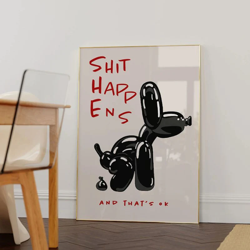 Cette reproduction de peinture audacieuse et décalée se distingue par son design inspiré de l’art urbain. Celle-ci représente un chien en ballon noir sur fond blanc, accompagné du message « Shit Happens, and That’s OK », un texte plein d’humour qui ne manquera pas de faire sourire vos convives.