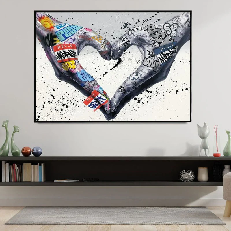 Ce tableau décoratif met en scène un cœur formé par deux mains, l’une est en noir et blanc et la seconde est agrémentée de graffiti colorés ! Parfaite pour créer une ambiance dynamique dans votre intérieur, c’est une reproduction de peinture pensée pour les amateurs d’art urbain et qui aiment se distinguer, même dans leur déco.