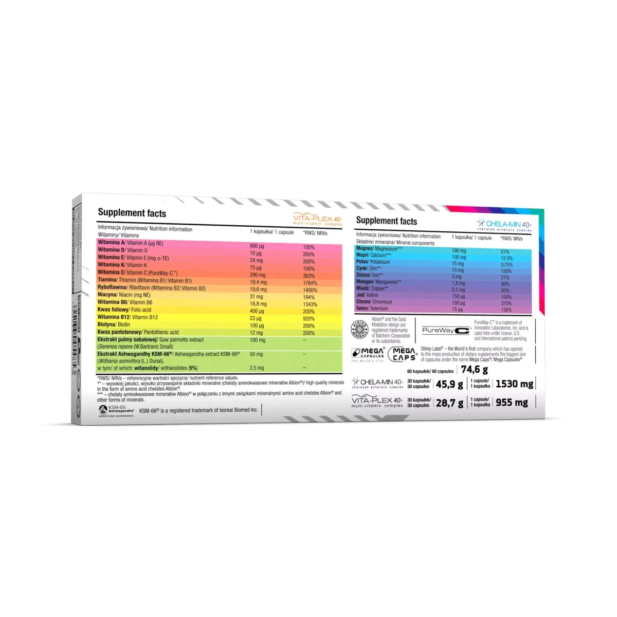 Olimp Vita-min Multiple Sport 40+ Mega Caps® représente la supplémentation multivitaminique de référence pour les sportifs de plus de 40 ans, avec son système révolutionnaire bi-composants : VITA-PLEX SPORT 40+ (vitamines + extraits végétaux) et CHELA-MIN SPORT 40+ (minéraux chélatés premium).
